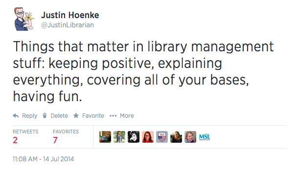 About a week ago I saw this tweet from the great Cate Levinson @storytiming. We talked about management and supervision in libraries over email and it was a great conversation…so great that it got me thinking that I really needed to share my most recent library management and supervision stories and lessons learned here on the blog.
